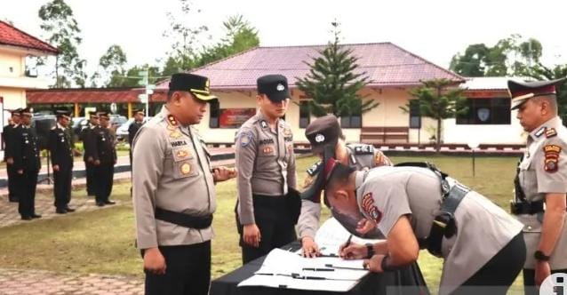Kapolres Humbang Hasundutan (Humbahas) AKBP Hary Ardianto memimpin pelaksanaan serah terima jabatan (sertijab) di lingkungan Polres Humbahas diantaranya Wakapolres, Kabag SDM, Kabag Ren, Kasat Reskrim, Kasat Narkoba dan Kasat Binmas di halaman Mapolres setempat pada Kamis (11/01/2024).