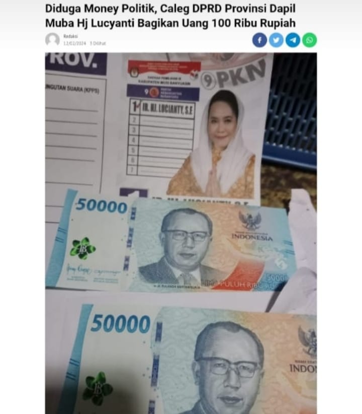 Diketahui, sehari sebelumnya salah satu media online menuliskan berita dengan judul: DIDUGA MONEY POLITIK, CALEG DPRD PROVINSI DAPIL MUBA Hj LUCYANTI BAGIKAN UANG 100 RIBU RUPIAH.