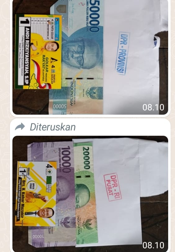 Sambil mengirim dua foto amplop, satu amplop bertuliskan DPR Provinsi, dan amplop lainnya bertuliskan DPR RI. Di dalam salah satu amplop itu ada uang 50 ribu dan sebuah kartu dengan foto salah satu caleg DPRD Sumsel Dapil Muba, sementara amplop yang lainnya berisikan uang pecahan 20 ribu dan 10 ribu, plus sebuah kartu bertuliskan nama, nomor urut, serta foto sang Caleg DPR RI Dapil Sumsel, keduanya dari partai bergambar beringin.