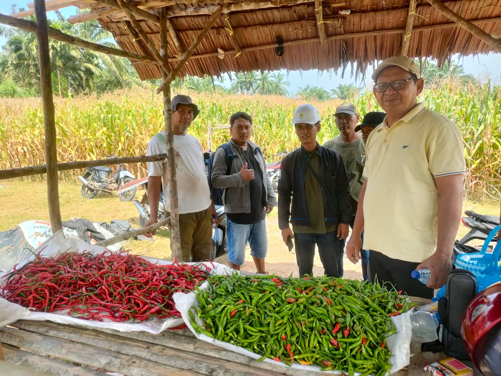 Teks Foto : Maneger BUMDes Karya Maju, Sutrisno, dampingi Kades Bandar Pulau Pekan, Azaswanto, BA beserta jajaran, dalam panen perdana Cabai, pada lahan ketahanan pangan Desa, Jumat 13/06).