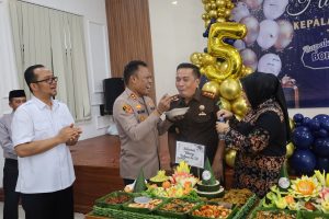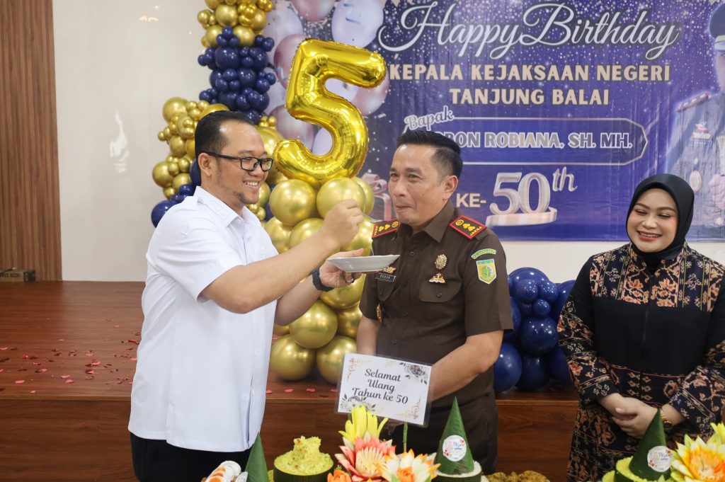 Wali Kota Tanjungbalai, Muhammad Fadly Abdina bersama jajaran Forum Koordinasi Pimpinan Daerah (Forkopimda) Kota Tanjungbalai, memberikan kejutan di Hari Ulang Tahun (HUT) ke-50 Kepala Kejaksaan Negeri (Kajari) Kota Tanjungbalai, Bobon Robiana, yang dilaksanakan di Aula Kejari Tanjungbalai, Rabu (21/1/2026).